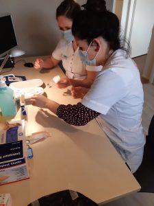 Bij het Pfizer vaccin is het zo dat je dit op locatie nog klaar moet maken. Ook is het belangrijk dat het Pfizer vaccin bewaard blijft bij een temperatuur tussen de 2 en 8 graden. Alle drie de teams hadden dan ook een speciale koelbox mee waar we het vaccin in meenamen. Vooral niet te hard rijden, zachtjes over de hobbels, en tijdens het lopen niet te veel schudden, was heel belangrijk. Uit 1 vaccin ampul opgelost met 1.8 ml NACL (fysiologische zoutoplossing) haalden we zes keer 0.3 ml vaccin. Was het vaccin eenmaal opgelost en klaargemaakt kon het niet meer vervoerd worden en als we iedereen op locatie gevaccineerd hadden kwam het wel is voor dat we spillage hadden. Dan konden we medewerkers, mantelzorgers, ouders van bewoners en collega’s het vaccin ook toedienen. We gooiden natuurlijk nooit wat weg.